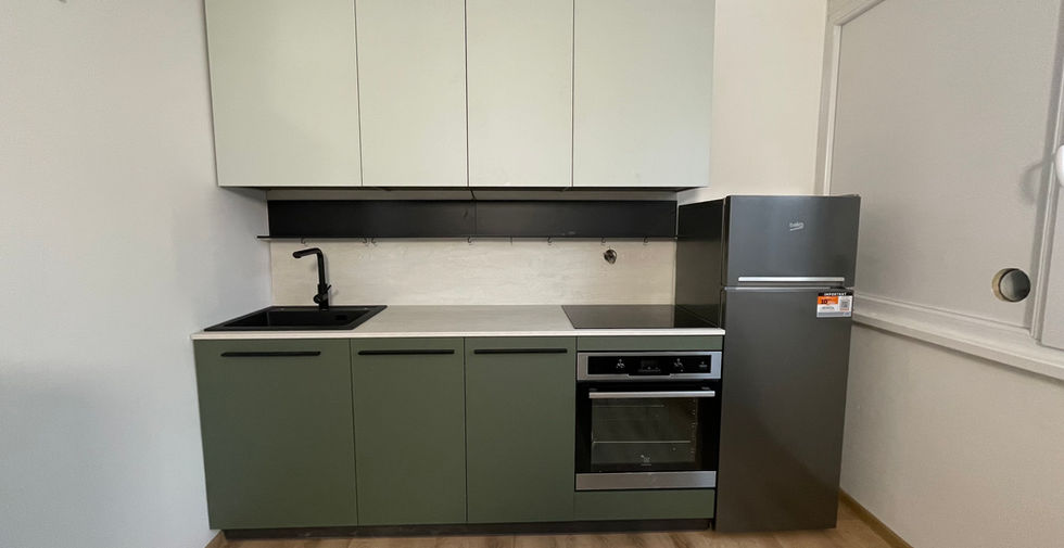 Kuhinja z jedilnico: Moderna, v zemeljskih tonih (zelena in bela), z vgradno pečico in kuhalno ploščo ter velikim hladilnikom